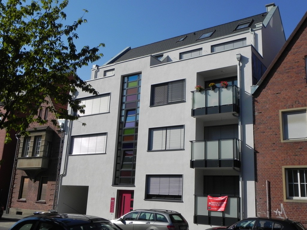 Im 1. OG eines 6-Parteienhauses befindet sich diese helle Wohnung mit interessanter Raumaufteilung: Wohnraum mit offener Küche und Zugang zu einem Balkon zur Hofseite, Schlafzimmer, geräumiges Badezimmer mit Dusche. Zu der Wohnung gehört ein Kellerraum im Untergeschoss sowie ein PKW-Außenstellplatz im Hof. Im Hof wird darüber hinaus ein überdachter Fahrradabstellplatz installiert. Die Tordurchfahrt erhält ein elektrisches Tor. Wahlweise kann eine Waschmaschine im Badezimmer in der Wohnung oder in einem im Keller hierfür vorgesehenen Waschraum mit eigenem Zähler angeschlossen werden. Zusätzlich zu dem Hauseingang an der Wilhelmstraße ist ein zweiter ebenerdiger Zugang zum Haus bzw. direkt zum Aufzug berücksichtigt. Dieser befindet sich in der Tordurchfahrt.